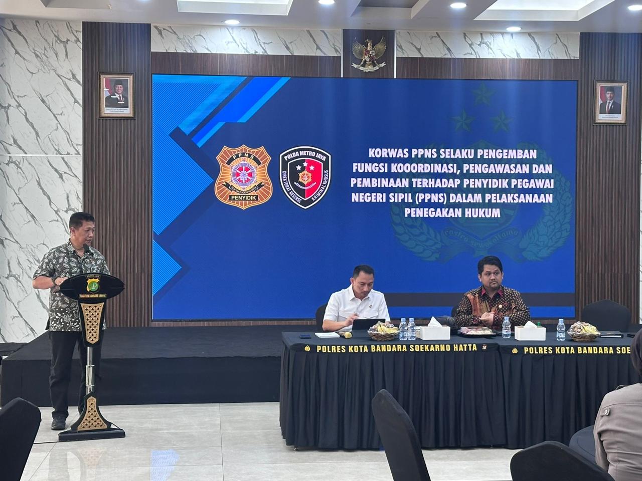 Banten, 12 Desember 2025 - Kasi Korwas PPNS Ditreskrimsus Polda Metro Jaya, AKP Joko Nugroho, S.H., M.H., bersama anggota Si Korwas PPNS menghadiri undangan sebagai narasumber dalam kegiatan rapat koordinasi penyidik Polri dan Penyidik Pegawai Negeri Sipil (PPNS) di wilayah hukum Polresta Bandara Soekarno-Hatta, pada Jumat, 12 Desember 2025, bertempat di Aula Lantai 5 Polresta Bandara Soekarno-Hatta.